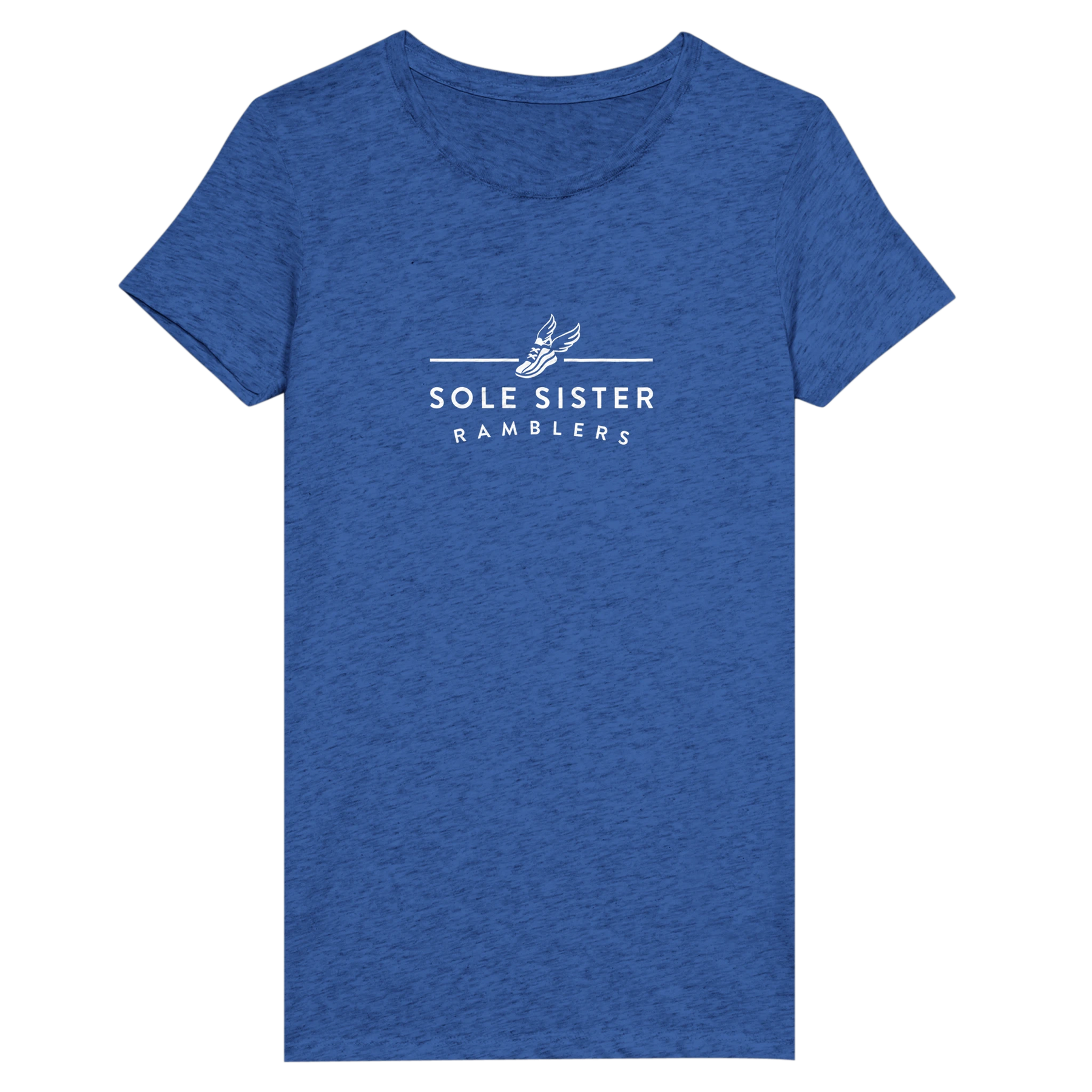 Blue t-shirt with white sole sister ramblers logo on white background.